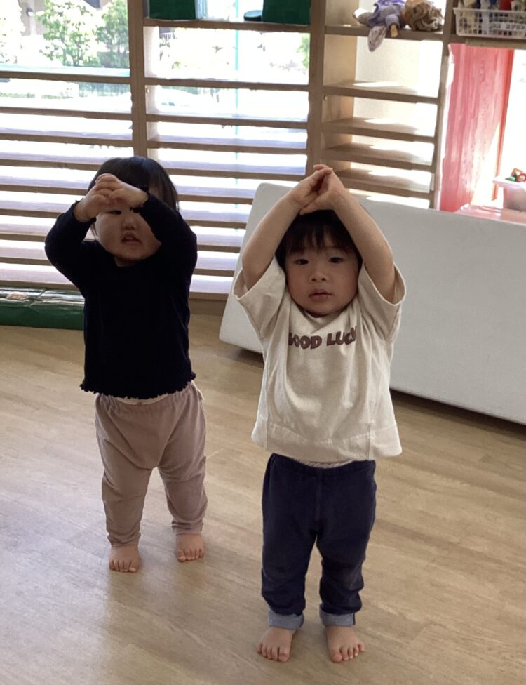 今月から始まったちゅうりっぷ組のお友だちも先生をよーく見て、真似してバナナのポーズ🍌