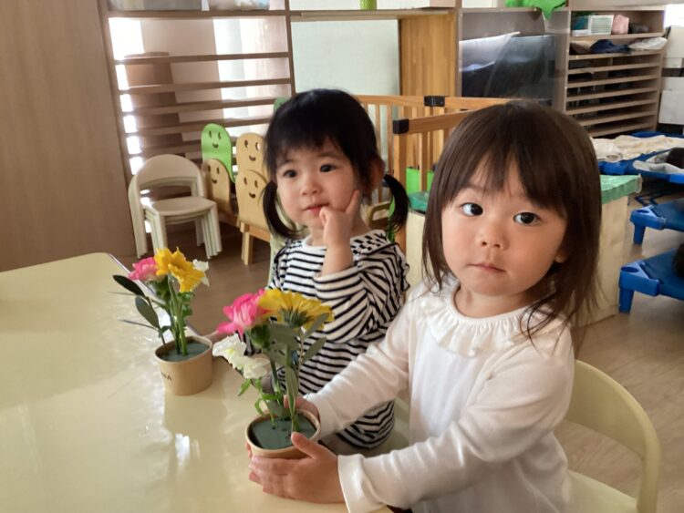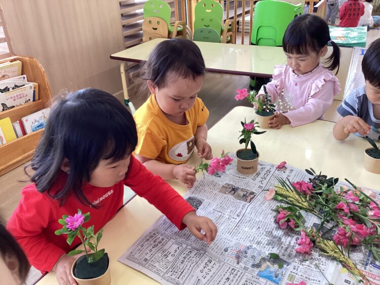 「ピンクのお花あるね」「キレイだね」と友だちや保育者とお話ししながらすきな花を選んでオアシスに挿すことを楽しんでいました😄