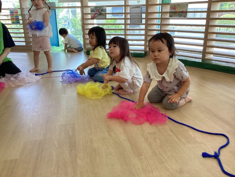 次は大きなプールの周りでシフォン布を水に見立てて水あそびをしました🚿