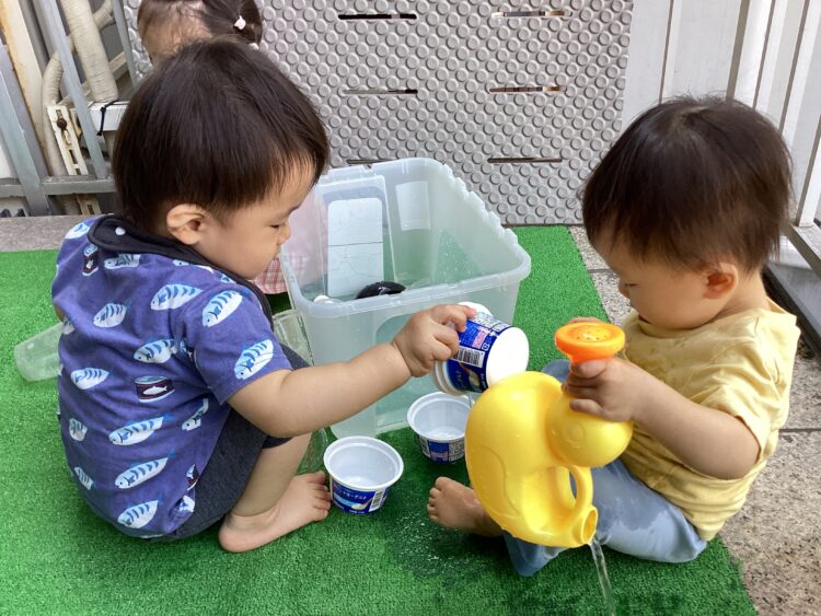 遊び方も上手になってきて、カップで水をすくって他のカップに移すなどして水に触れて楽しんでいましたよ😊
