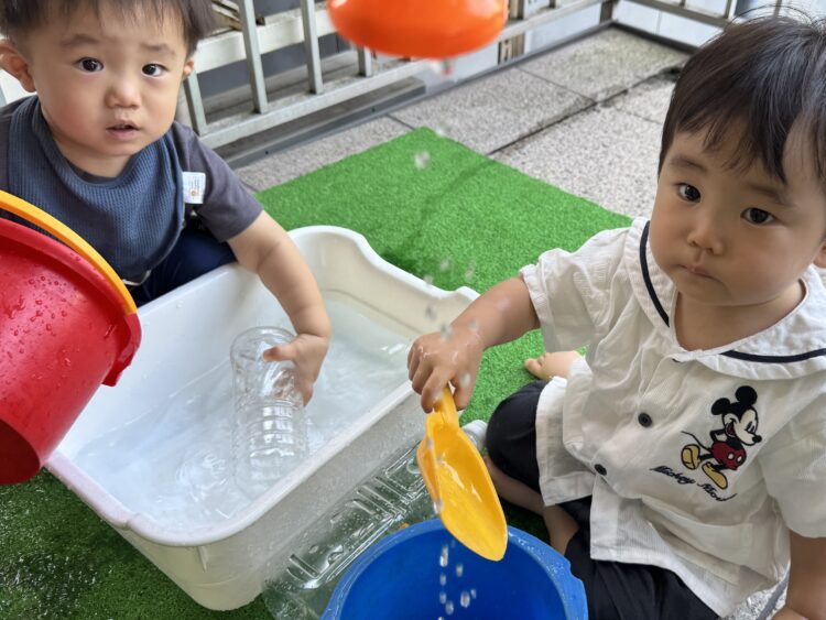 保育者の腕や肩に水をかけてくれて、「冷たくて気持ちいい!」と伝えると、「お水気持ちいいね🚿いっぱいじゃーしゅるね」と、保育者と水をかけあって楽しんでいました🤭