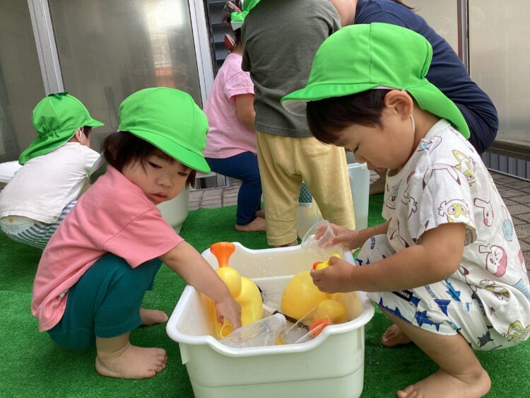お玉で水や玩具をすくって楽しむお友だち😄