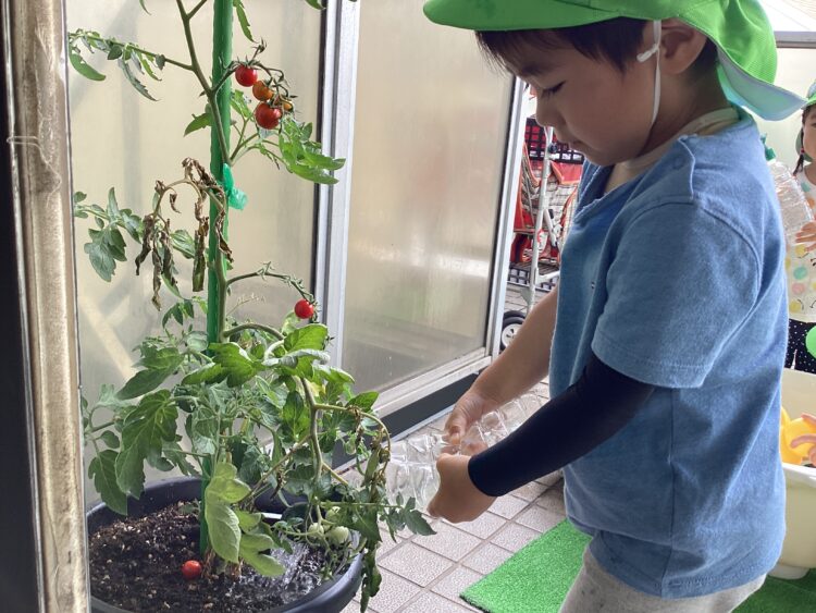 みんなで育てているトマトに水をかけてくれるお友だちもいましたよ😄