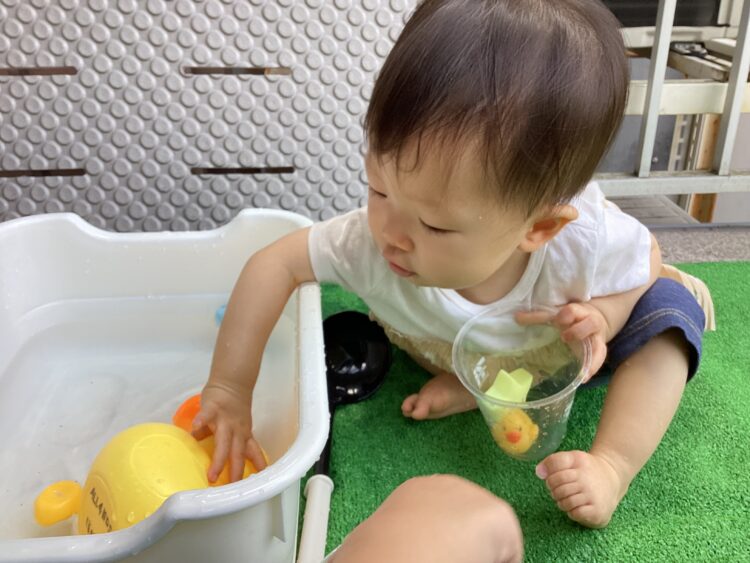 水の冷たさが気持ちよくて、水面をパシャパシャ叩いたり、掴もうと触れたりして楽しんでいましたよ😊