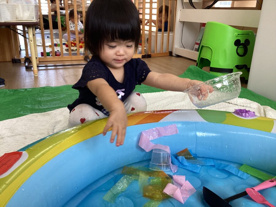 今日はお水にカラービニールを入れると、ジュース屋さんごっこが始まりました🍹