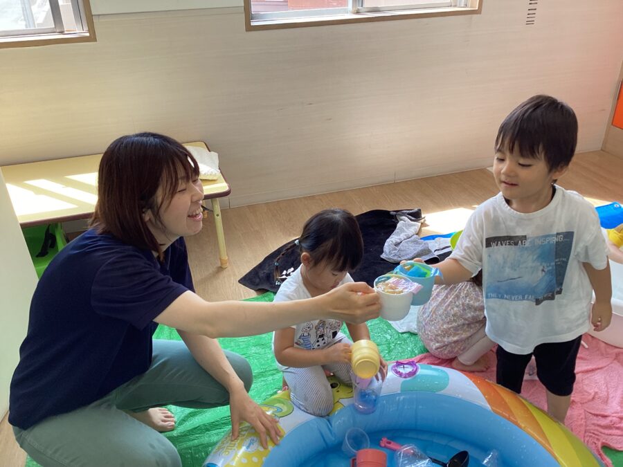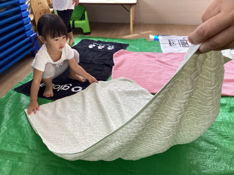 今日も保育者が水遊びの準備をしていると…遊びたい気持ちから、自分たちでタオルを敷く姿が見られました👏タオルを敷いた後にピシッとシワを伸ばして、きれいに整えていましたよ✨