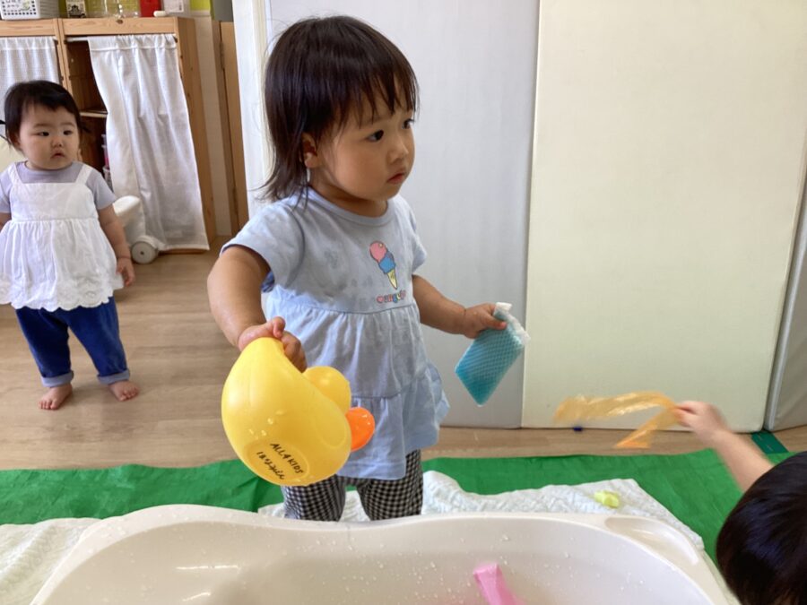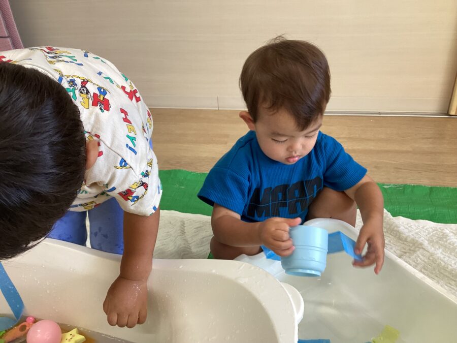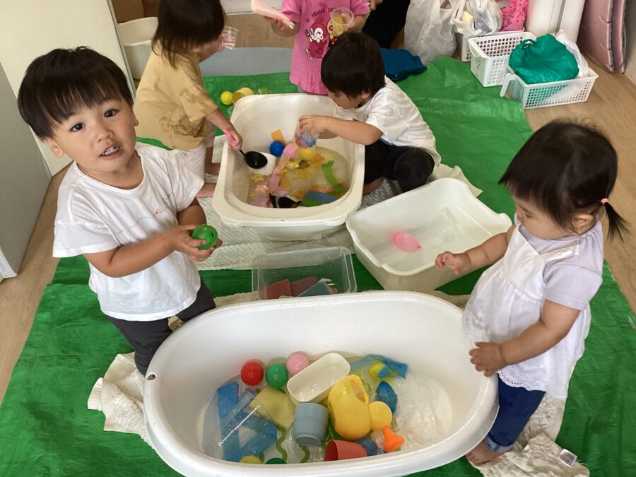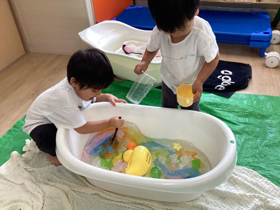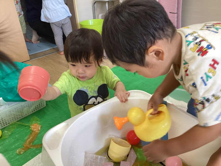 ジョウロやカップを使って水を流したり、カラービニールを入れてジュースを作ったりして水と仲良し✨