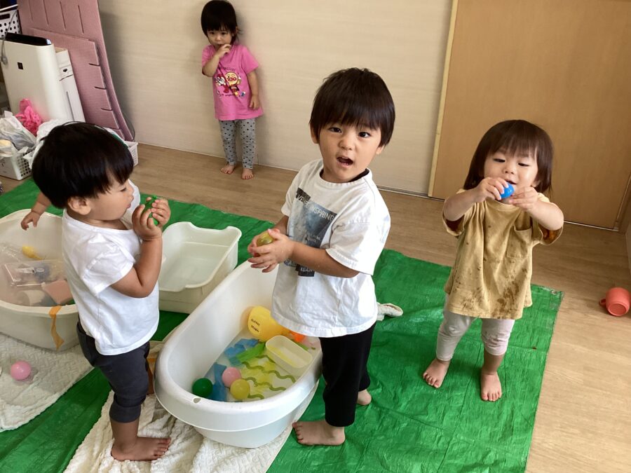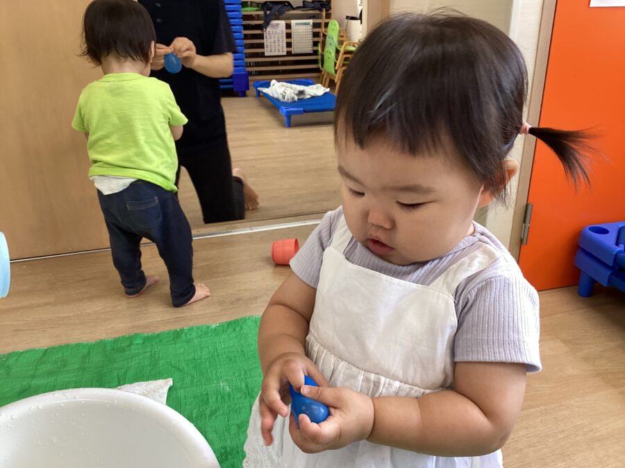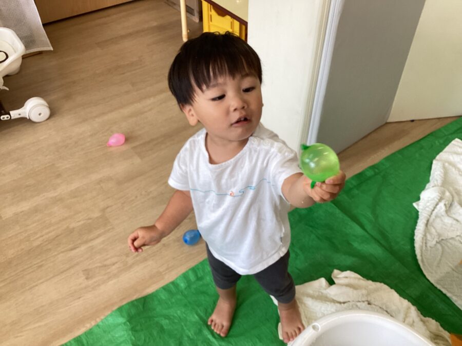 水風船を見つけると、ギューーーッと握ってムニムニした感触を楽しんだり、プニップニッと変形していく様子を見て面白がって遊ぶ姿が見られました👀