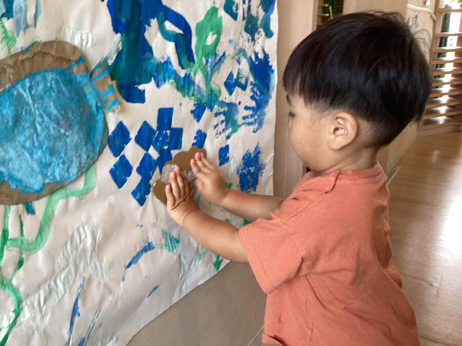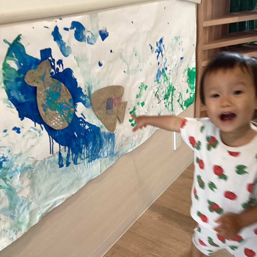 以前の保育参観でやった、海の生き物を「また作りたい🐡🐟」とリクエストがあったので、フィンガーペインティングをして魚やヒトデを作りました。