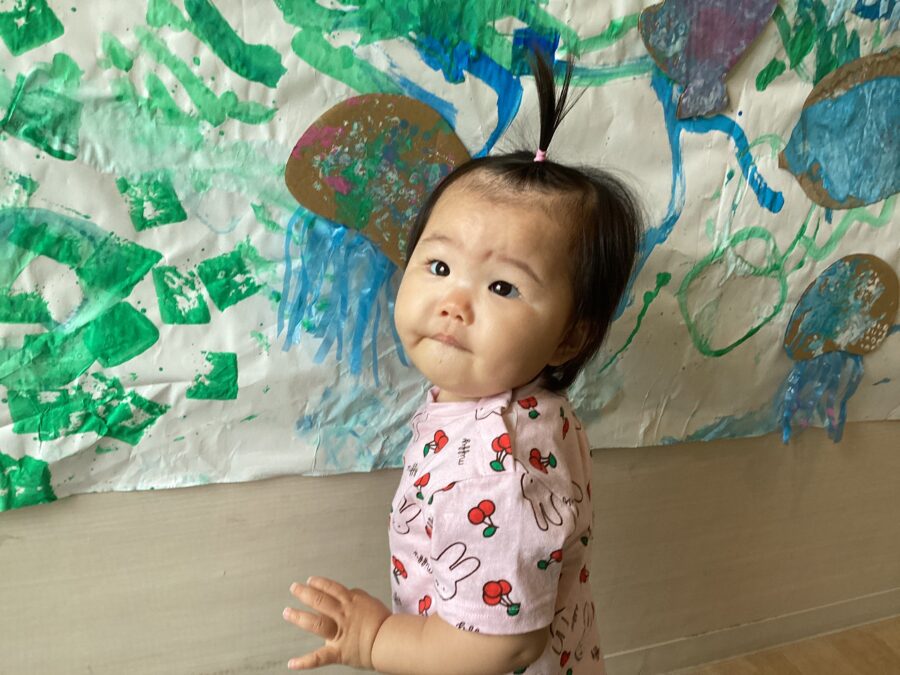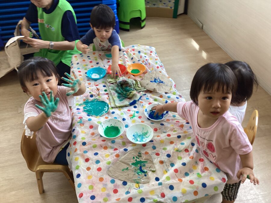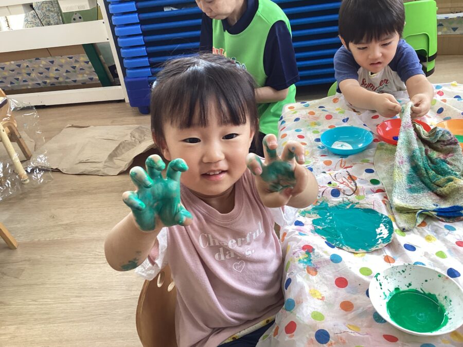 「見て~!こんなになっちゃった!」と緑に変身した手の平を嬉しそうに見せてくれました冷たくてヌルヌルして気持ちいいね