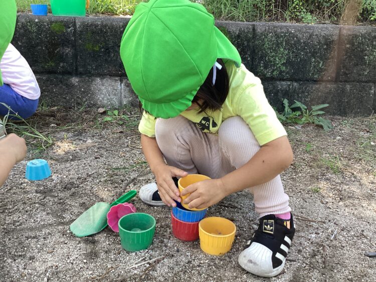 昨夜の雨で砂が湿っていて、型抜きなどに程よい硬さの砂になっていて、プリンなどご馳走を作ってお店屋さんごっこも楽しんでいましたよ🍮✨