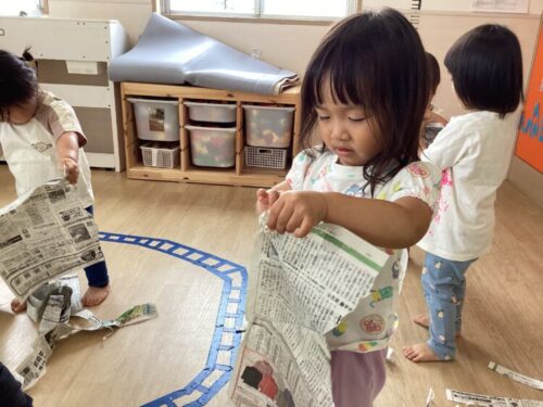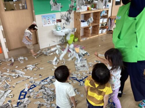 穂波園にたくさんの新聞紙の雨が降って来ました〜〜☔️☔️☔️