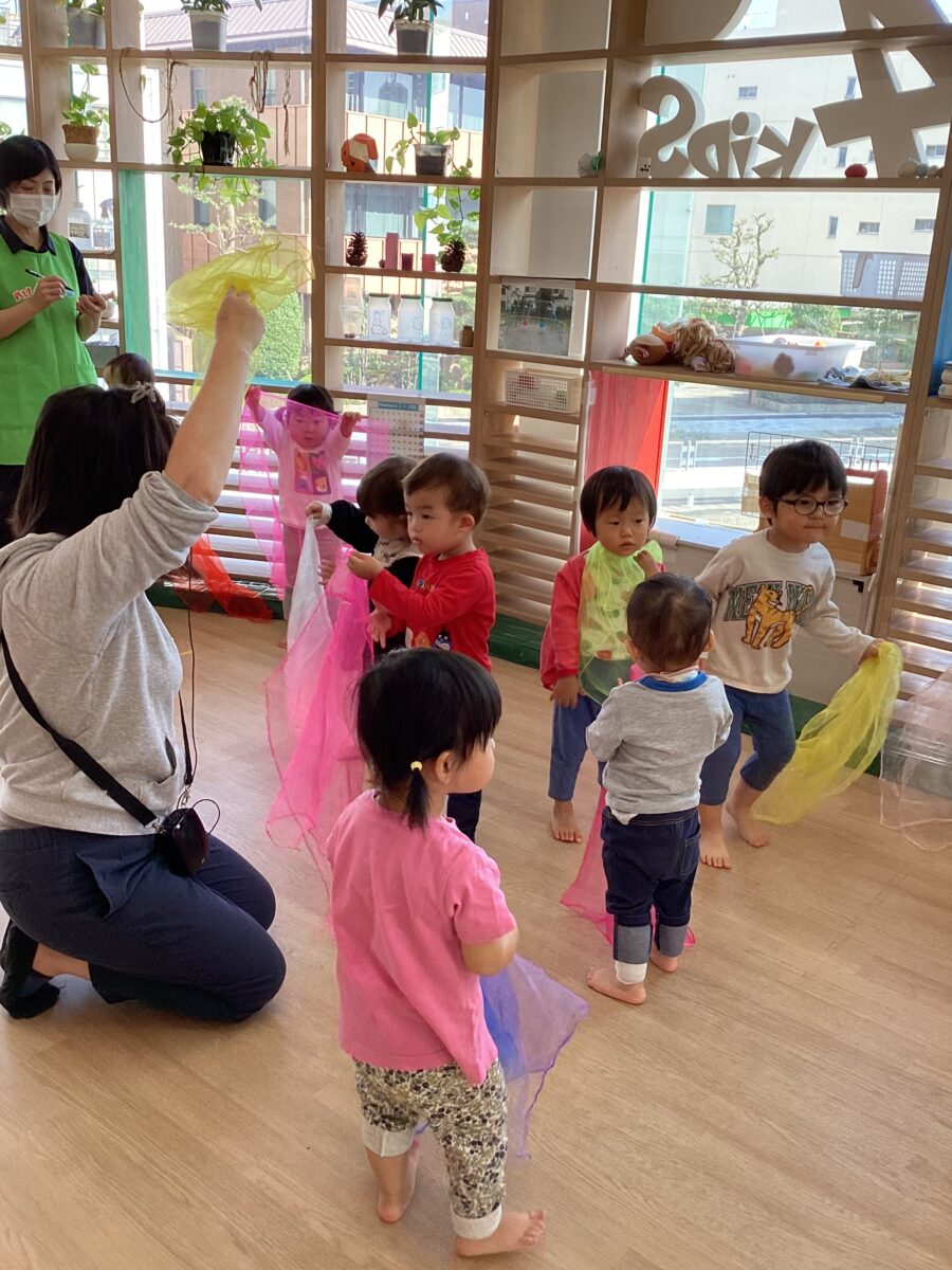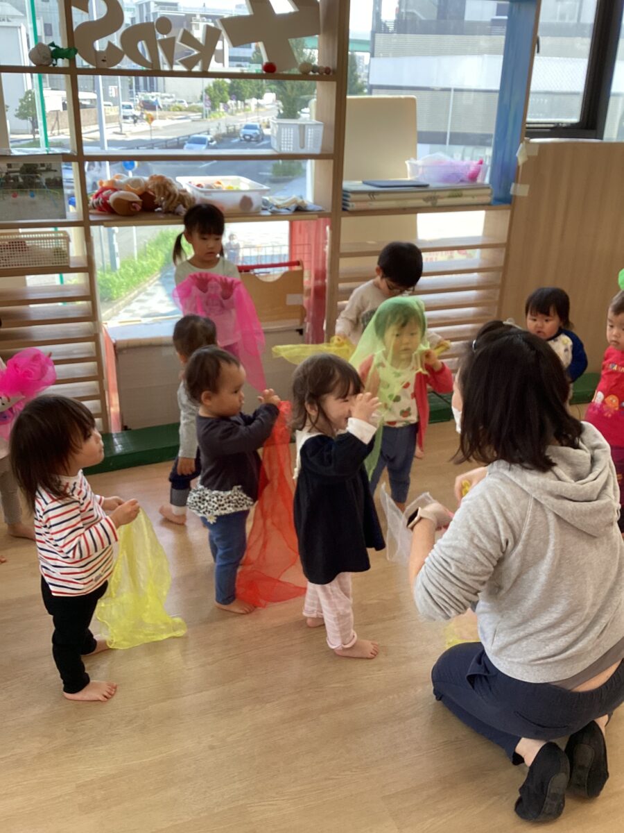 キレイなスカーフを持って落ち葉をゆらゆらさせると、みんなの顔もにっこり☺️