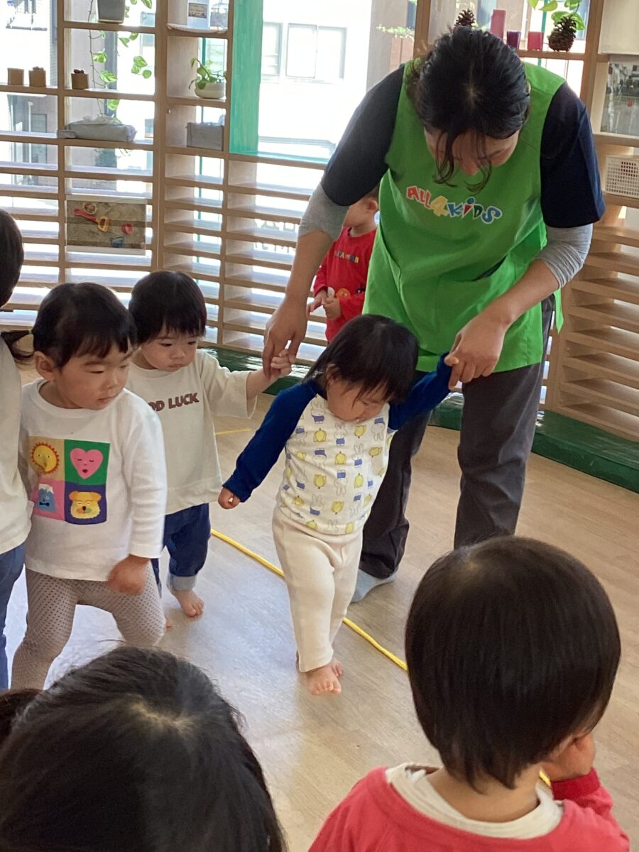 ピアノのリズムに合わせて、「よいしょ!よいしょ!」とゆっくりと歩き、頂上に着くと「わーい🙌」と両手をあげて喜ぶ子どもたちでした😆