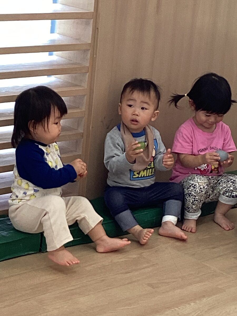 たくさん体を動かした後は先生から大好きなマラカスや鈴を貸してもらって「山のおんがくか」を演奏しましたよ🎵