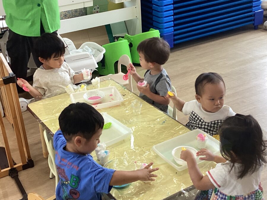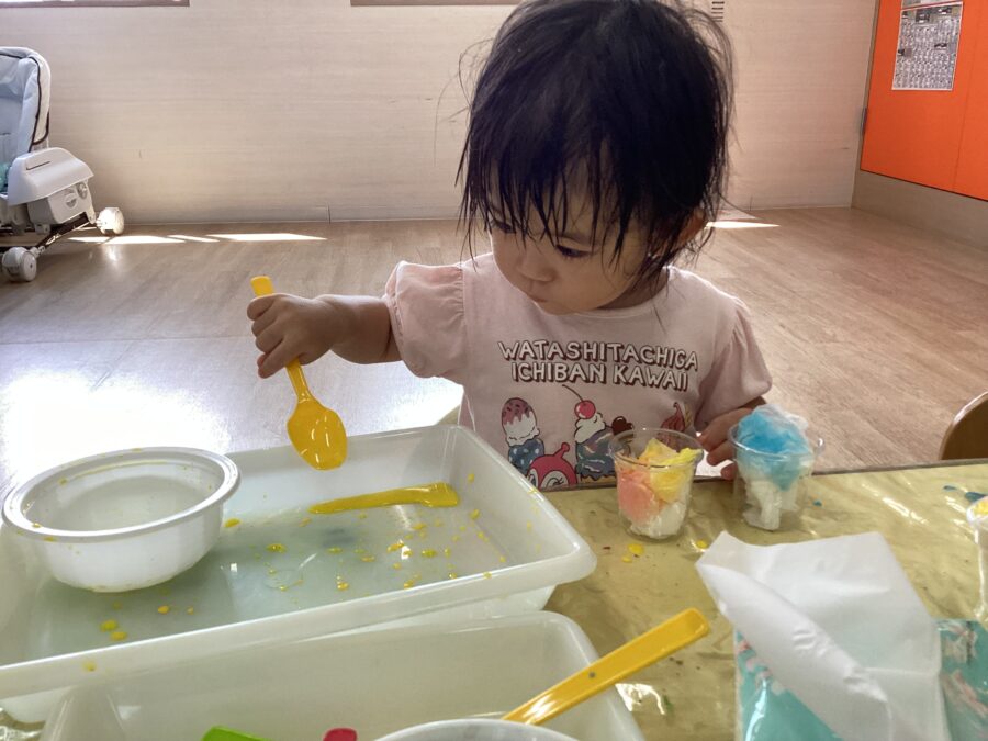 いろいろな色をかけて「ミックス味だよ✨」と教えてくれるお友だちもいました🌈美味しそうなかき氷が沢山できましたよ🤗