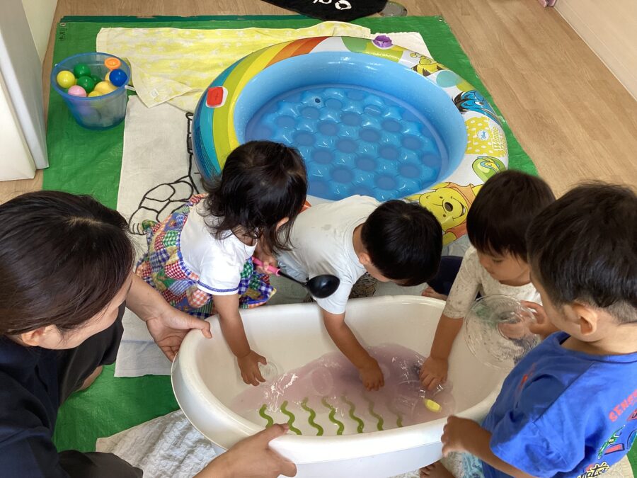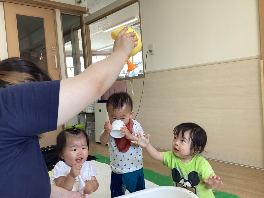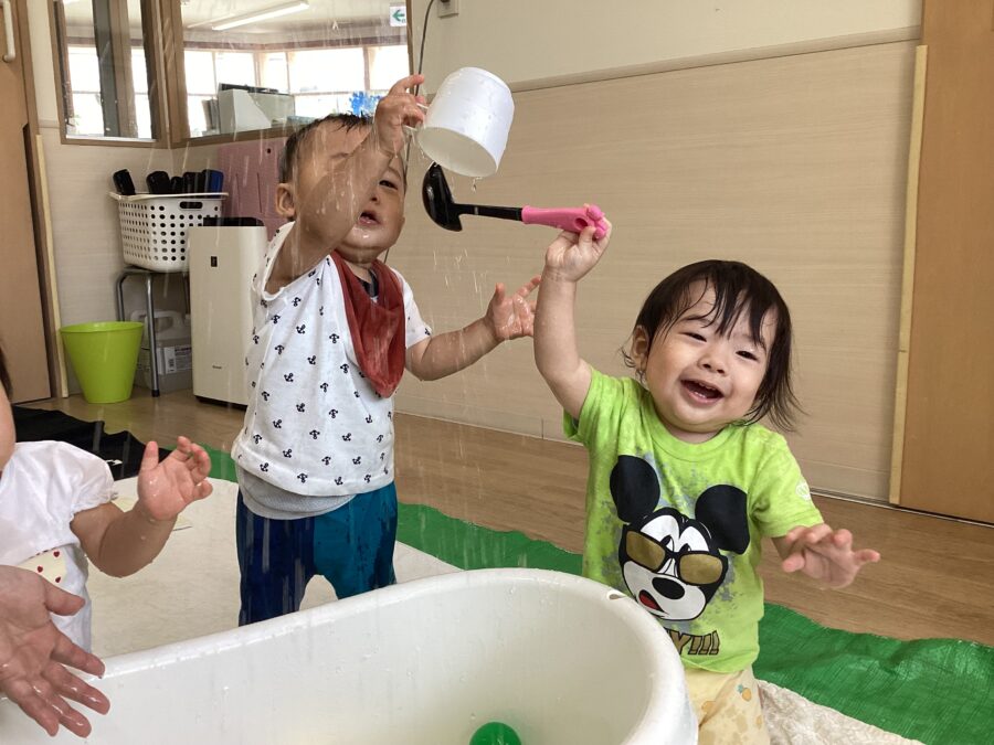 友だちと力を合わせて、タライは見事からっぽになっていましたよ👏