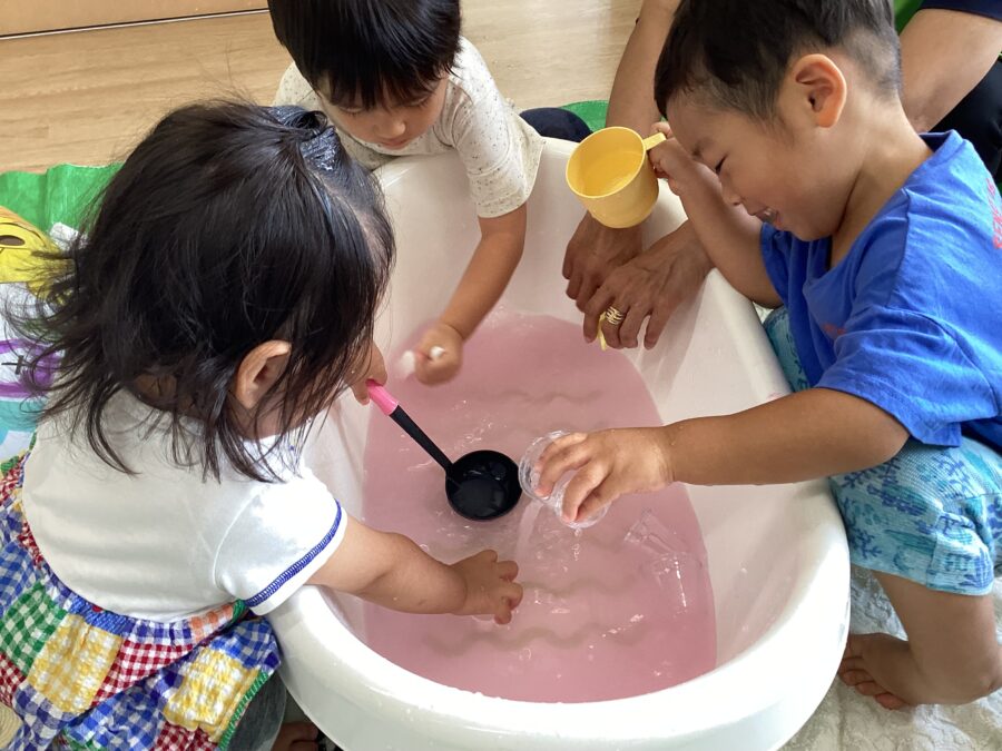 色水をジュースに見立てて「カンパーイ!」「Cheers!」🥂とジュース屋さんごっこをしたり
