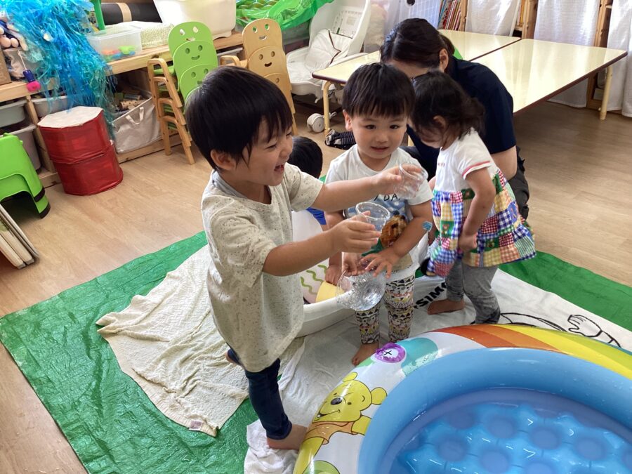 タライからプールへ、小さなカップで何度も水を運んで、入れ替え大作戦も始まりました‼️