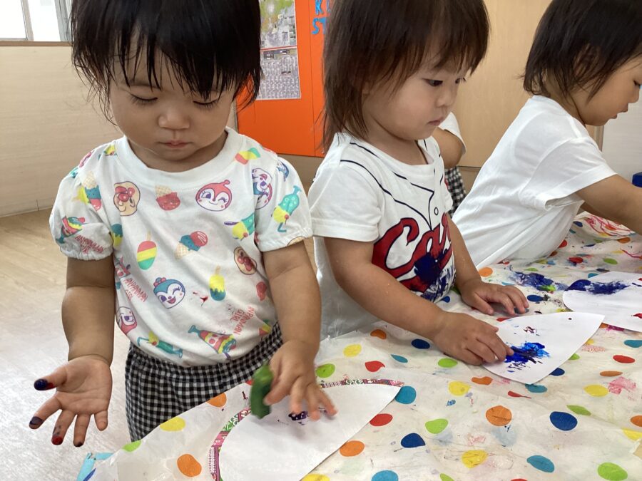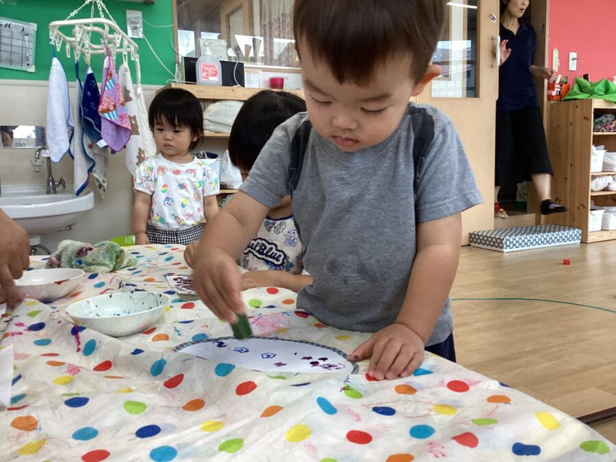 今日は、きらきら星の歌を歌ったり、七夕のお話を聞いた後、オクラで野菜スタンプをして遊びました。