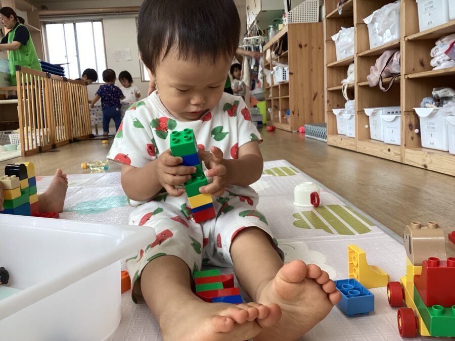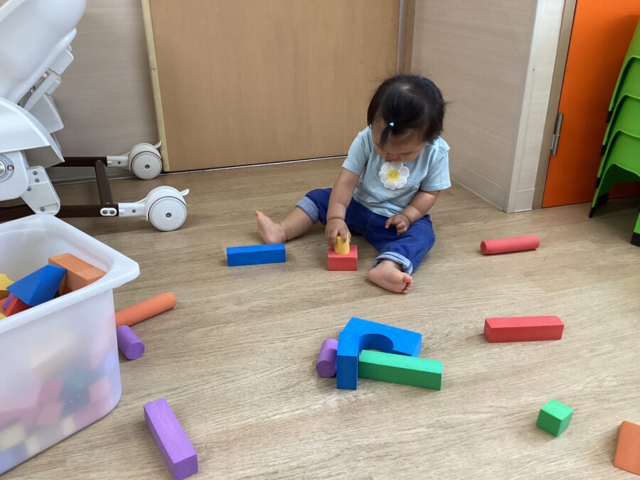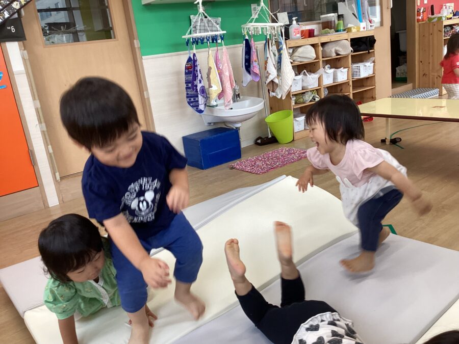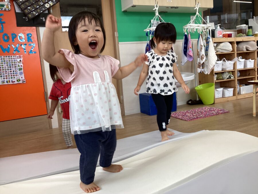 マットの下に台を入れて、凸凹マットの上を歩いたりハイハイしたりして遊びました。足元が不安定なのが面白く「あっ!」「おぉ〜!」と言いながら上手にバランスを取って体を動かすことを楽しんでいましたよ🏃♀️