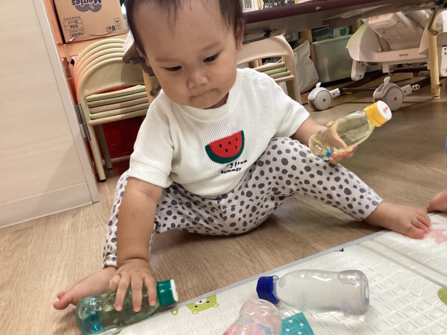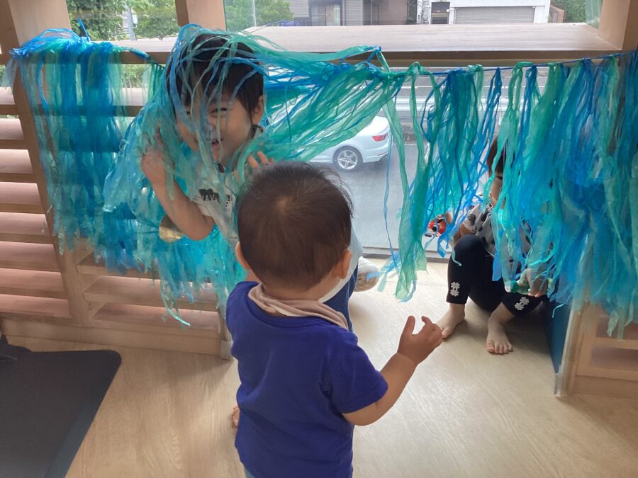 カラーボールの感触や、かき回してガラガラ鳴る音を楽しんだり、トンネルから出てきて「いない いない ばぁ〜」とお友だちや保育者を驚かせてニコニコの子どもたちでした🤗