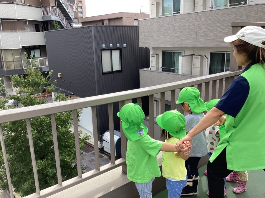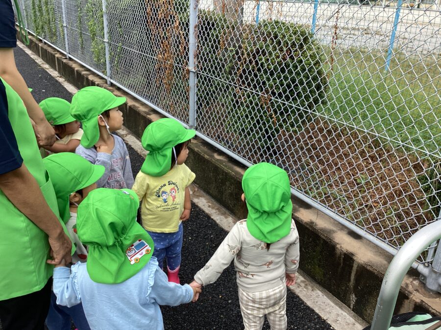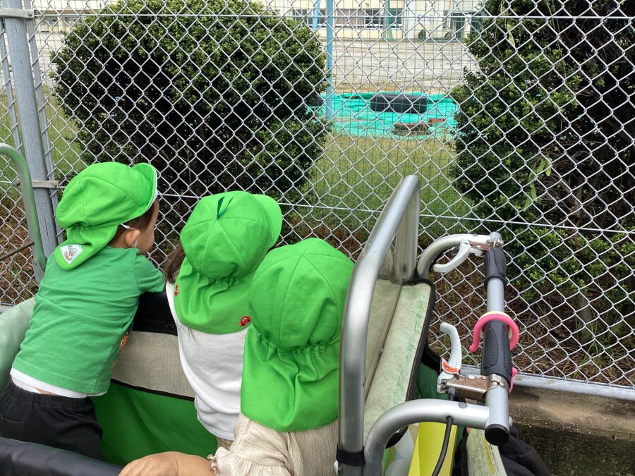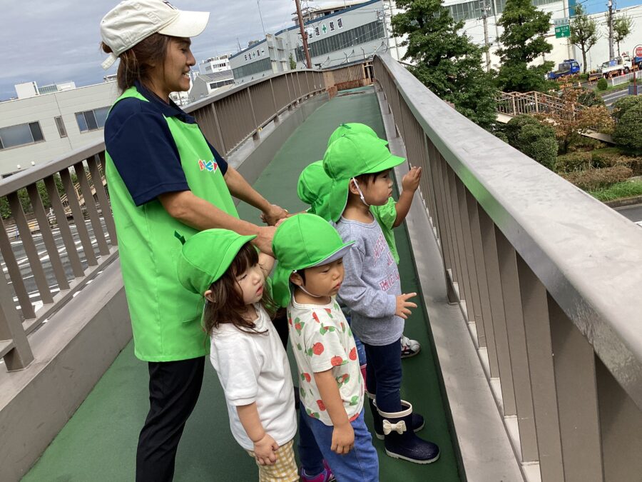 歩道橋の上からは保育園も見えて、ちょうど玄関に入ろうとする先生やお友だちを見つけ「おーーーい👋」と手を振っていました😊