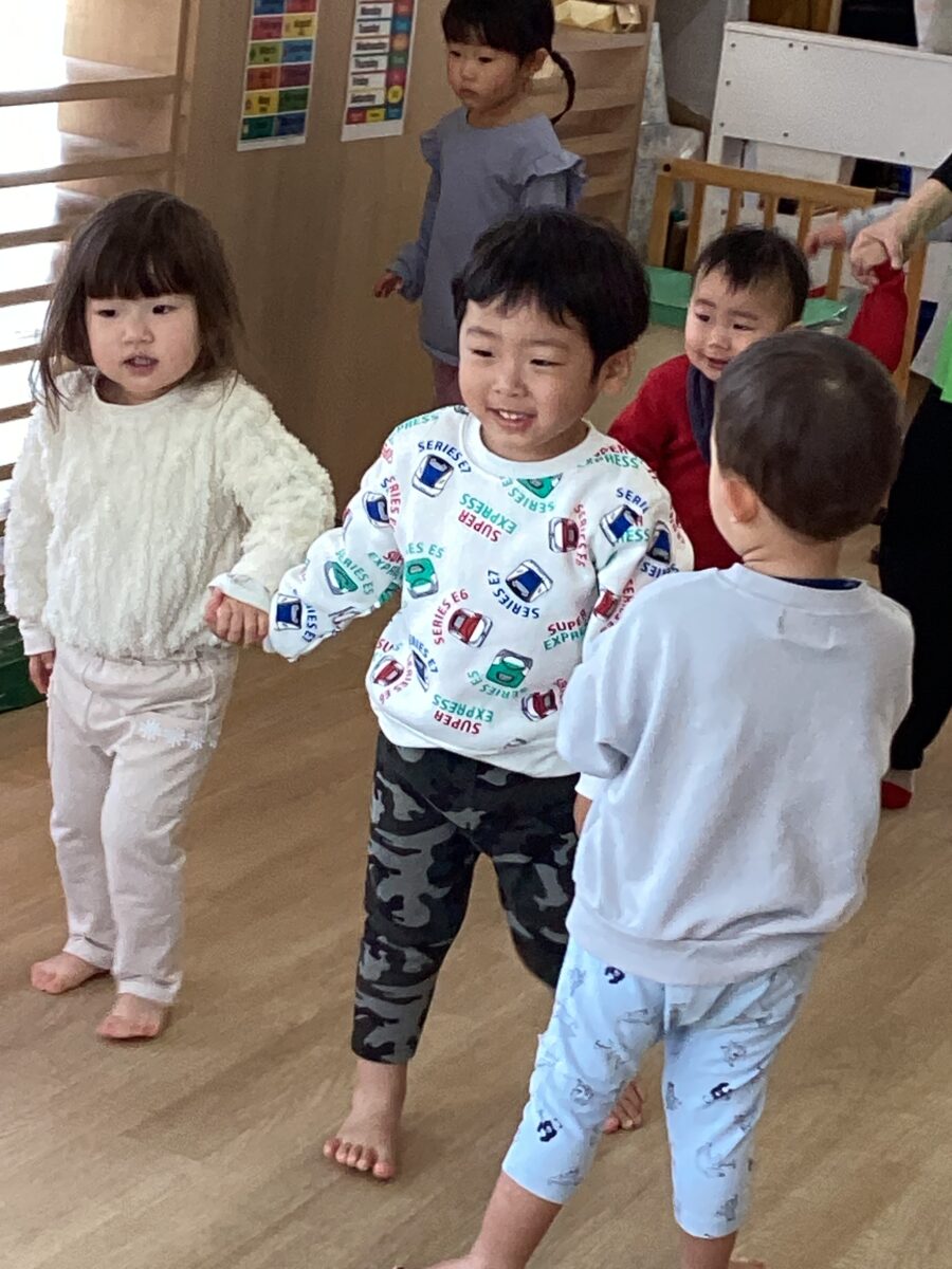 「手を繋ごう~✋」と仲良くお友だちと一緒にお部屋の中を歩いていました。