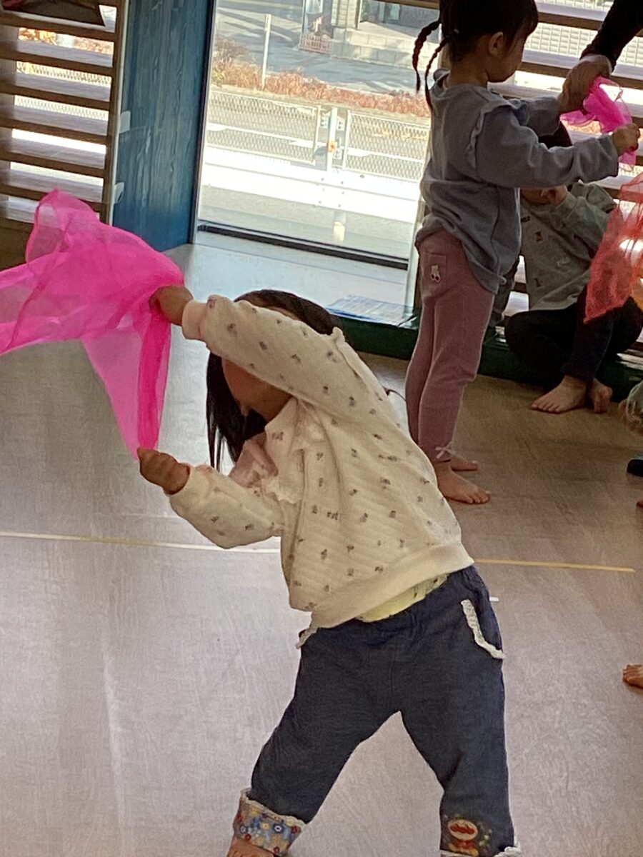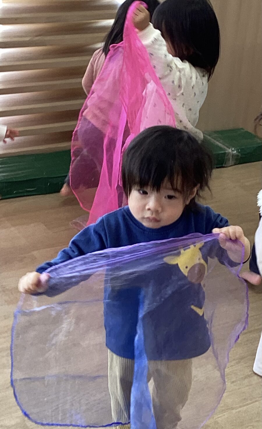 今月は「お正月」をテーマにして、シフォン布を使った凧揚げのイメージあそびもやってみました![]()