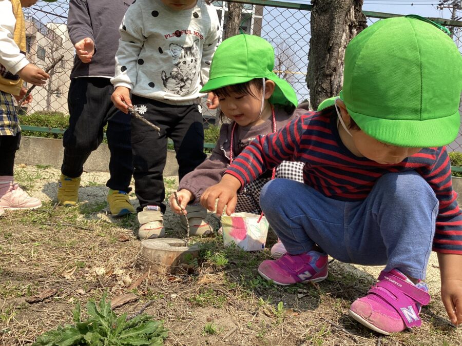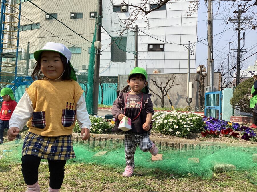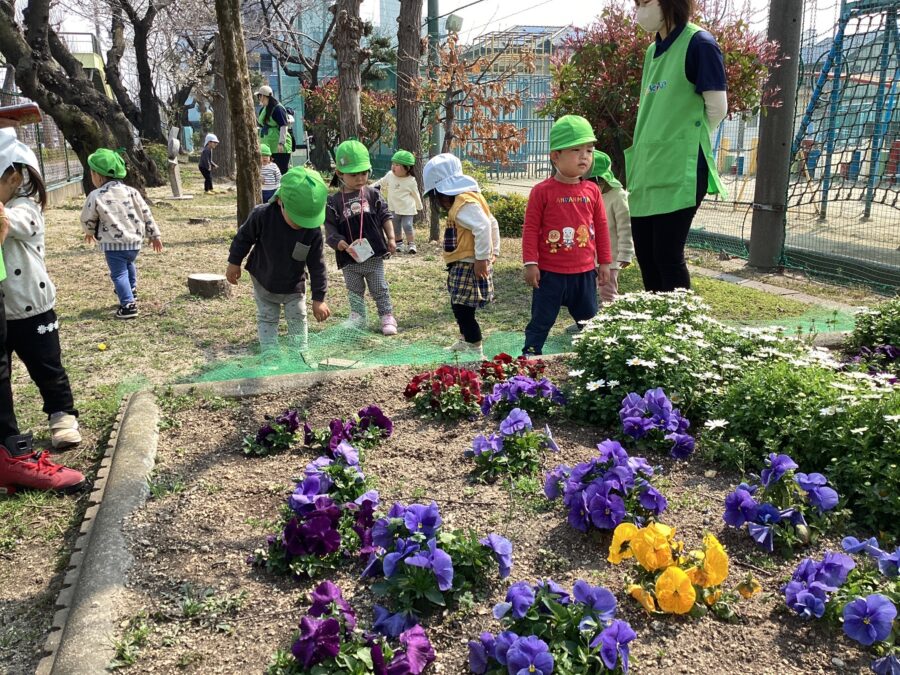 花壇に咲くお花たちを見つけると「あ、White あるよ!」「YellowとBlueもあった🥰」など日本語と英語の単語が入り交じり、楽しいお話で盛り上がっていました✨