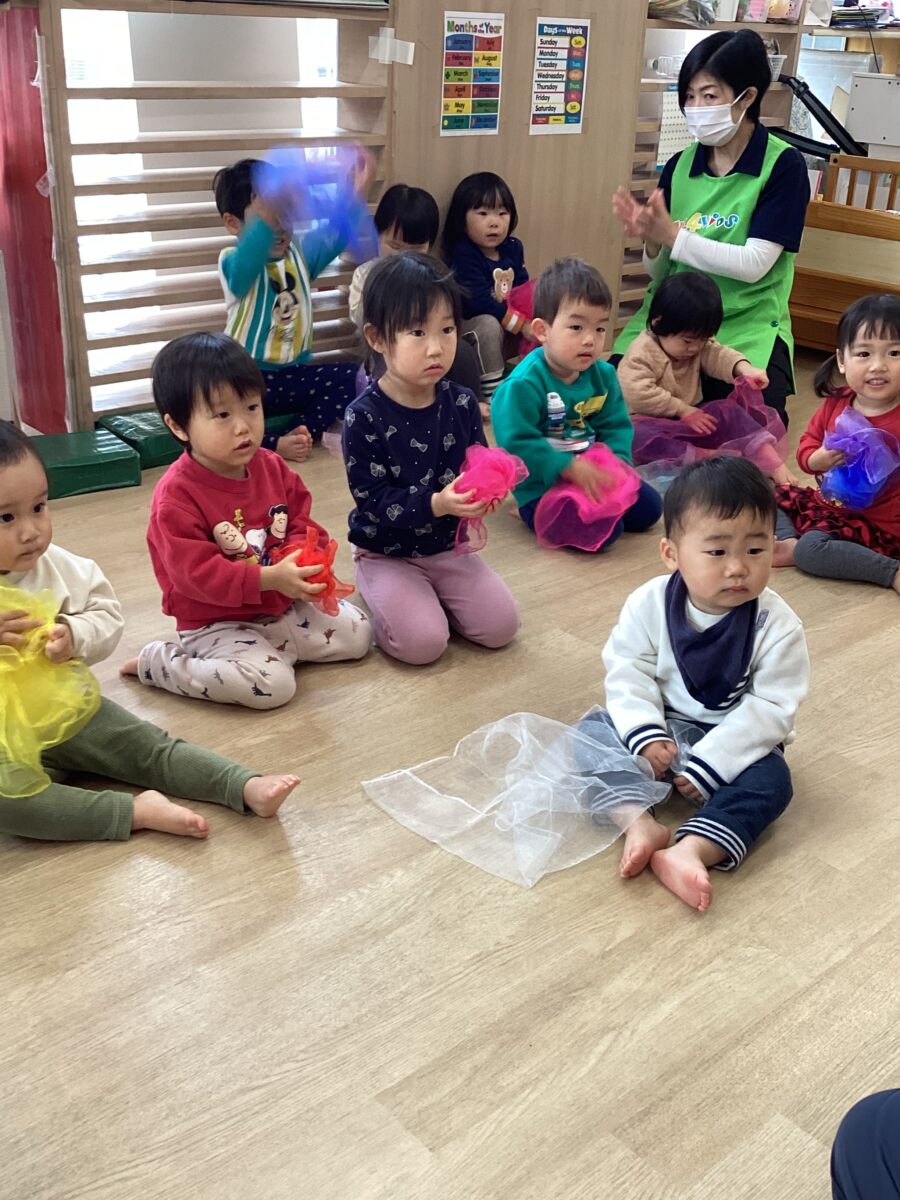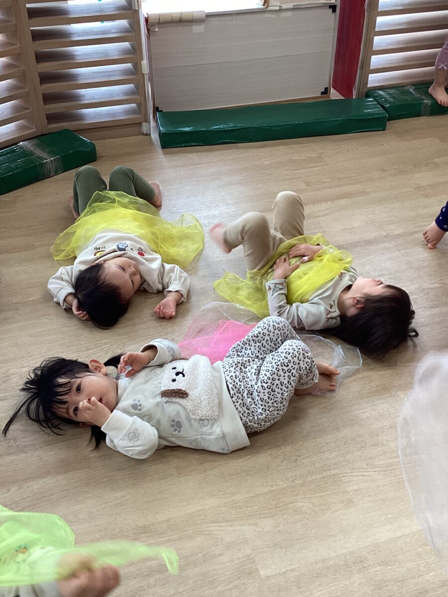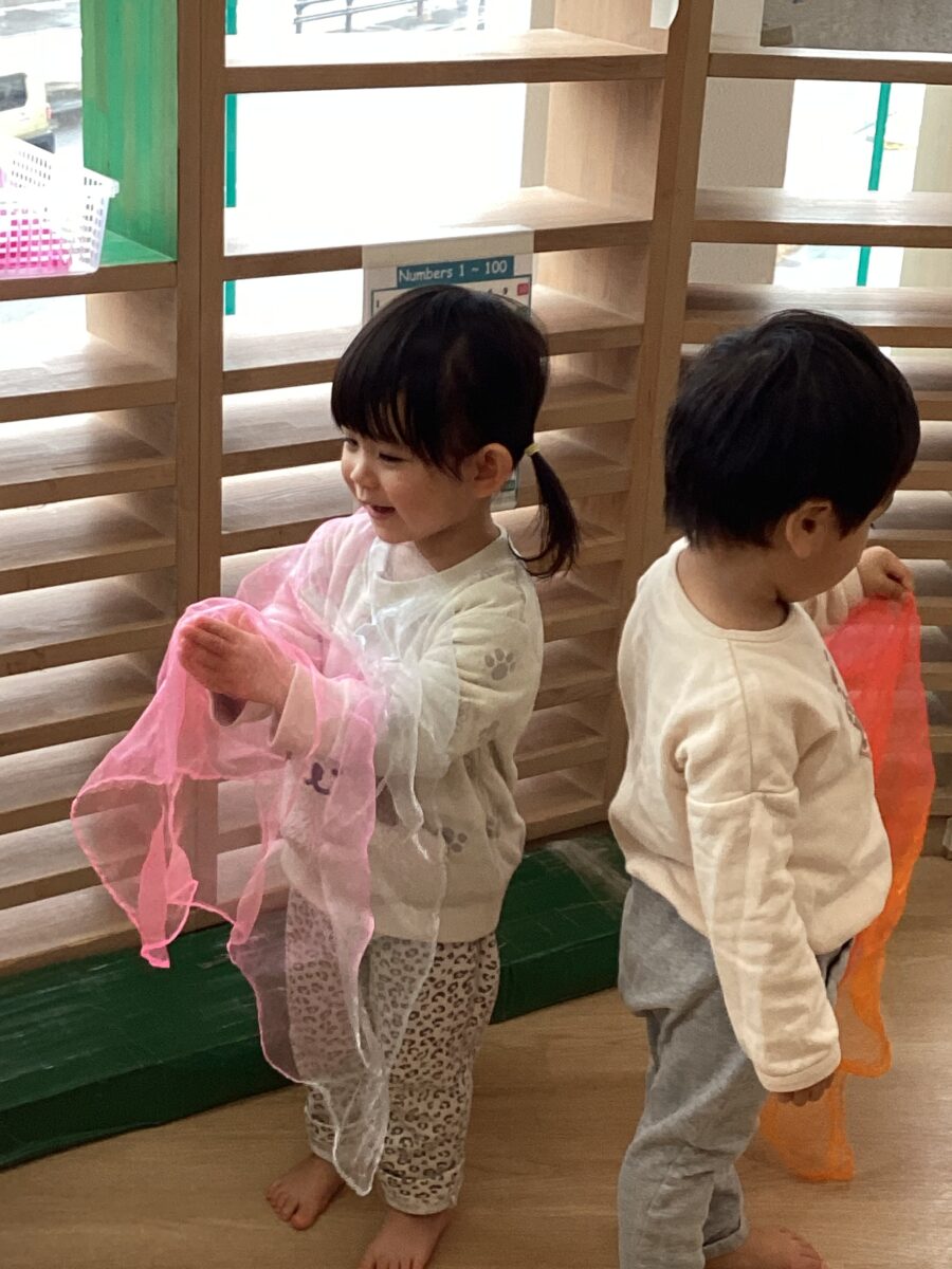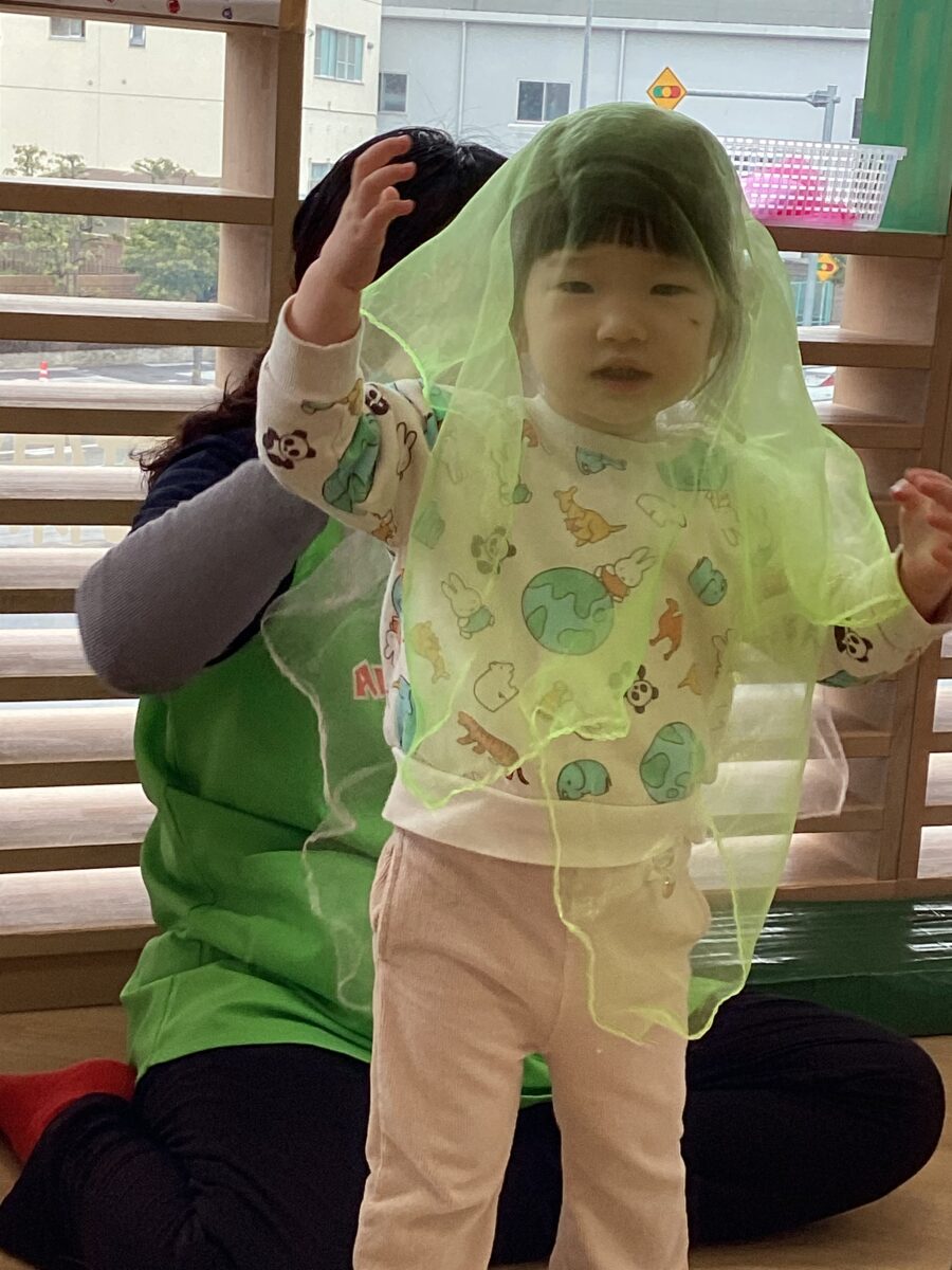 シフォン布を「蝶」や「ヘビ」に見立て、春あそび♪