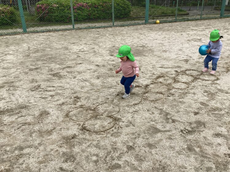 地面に丸を描いてケンケンパ!最後までできると、嬉しそうに「できた!」と保育者に教えてくれて、一緒に喜びました😄