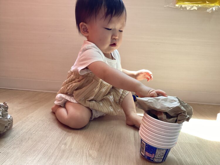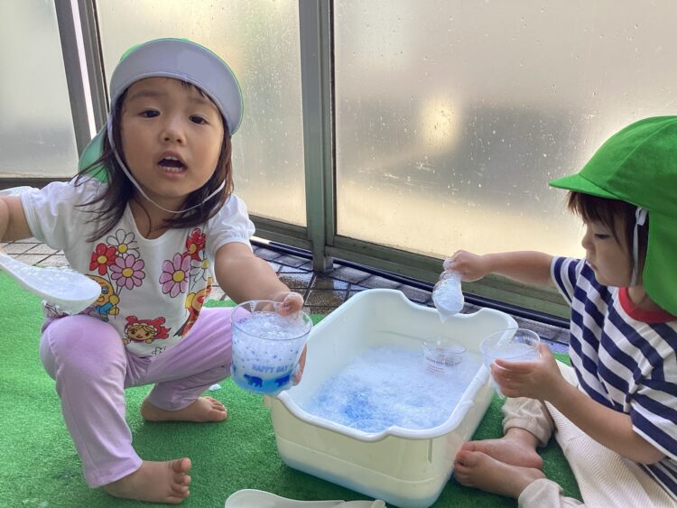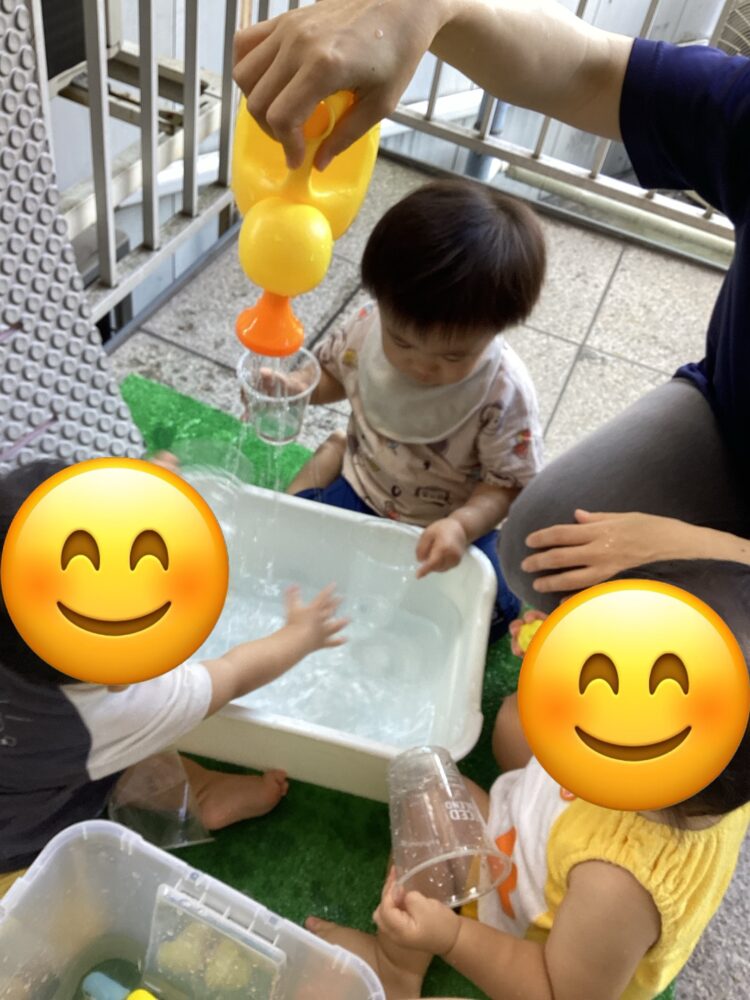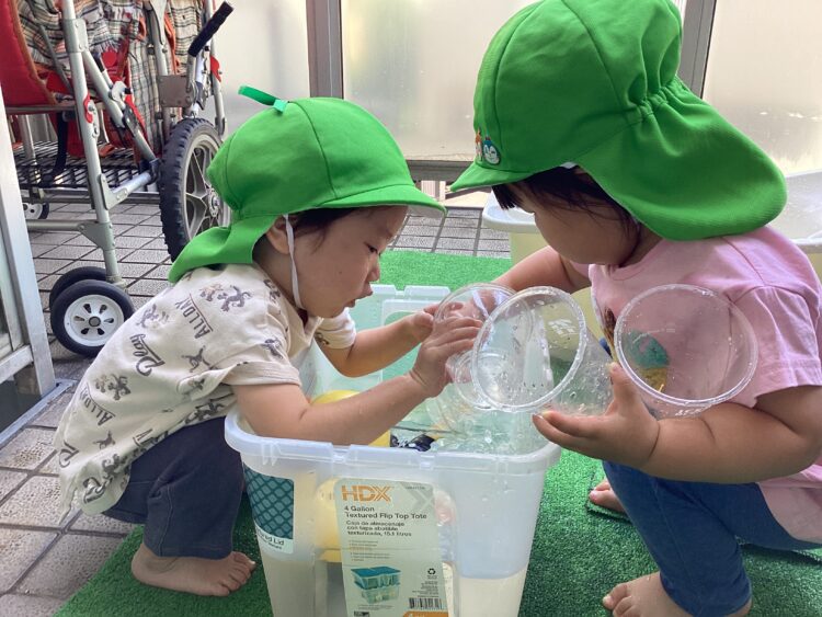 カップで水をすくって「どーぞー!」「おいしいよ」とジュース屋さんになりきって楽しんでいたお友だち🍹