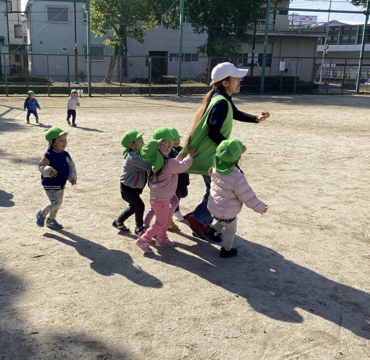 「まって〜」「つかまえた〜🙌」と保育者や先生を追いかけて楽しんでいました😊
