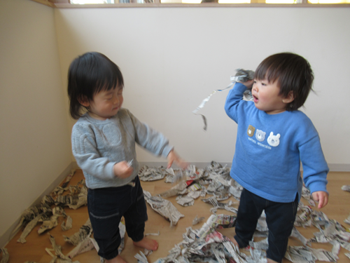ひよこさんはおともだち同士で新聞紙を投げ合って