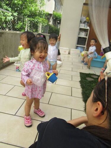 全身濡れても気にしない子は先生がやる雨のシャワーの下に集まってきてきゃー(≧∇≦)と声を上げて楽しんで水を浴びていました![]()