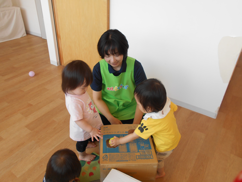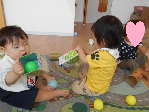 拾ったボールを箱の穴に入れてます。上手に入れてますね!