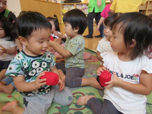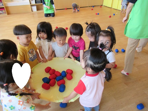 子どもたちは一人ずつ玉を先生にもらい、握ったり見つめたりしています😄