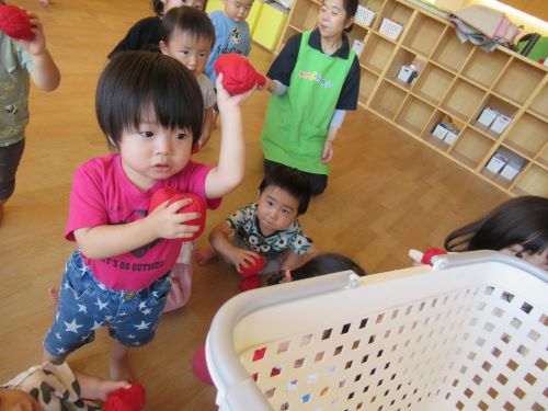 よーいどん!!の掛け声で、かごに玉を投げ入れてみます!!みんなとっても上手に「ポイ!」と投げていましたよ🌟