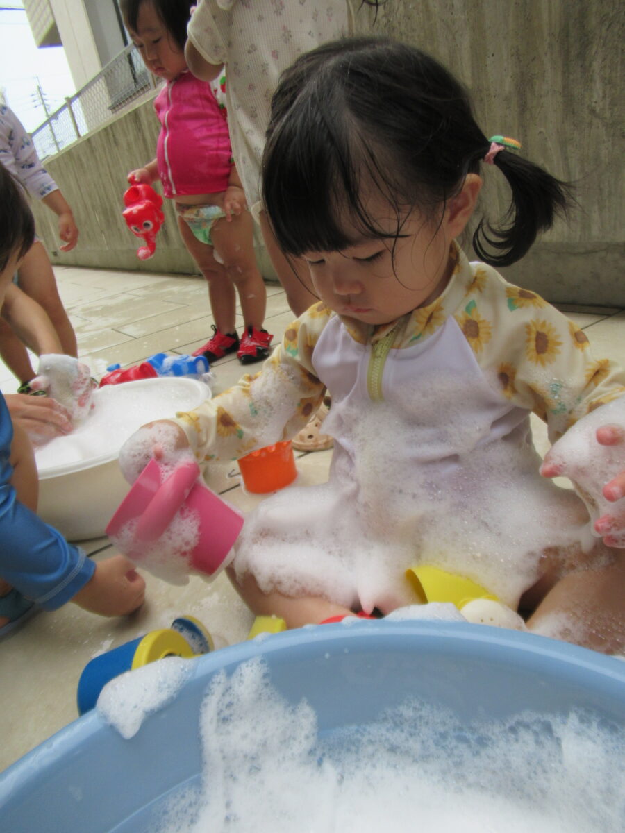 先生に泡を身体につけてもらうと、もこもこした泡を不思議そうに見つめるお友だち🌟