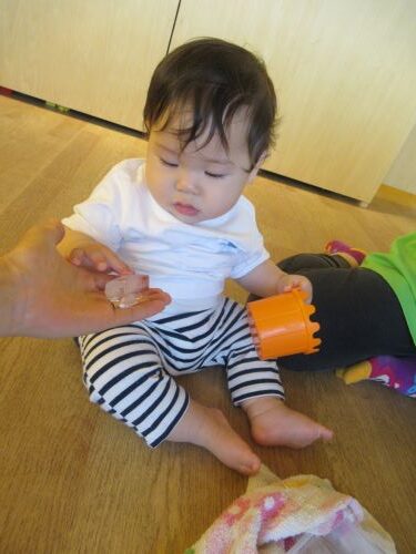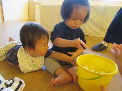 自分で行きたいところへずりばいをしていき興味持ってあそぶひよこ組のお友だちやタライを持ち何度も傾け氷がすべるのを楽しむ子の姿がありましたよ😛