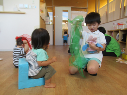 少し緊張気味のお友だちもいましたが、絵本を読んでくれたりリトミックスカーフでマジックをして見せてくれたりとみんな興味津々👀✨