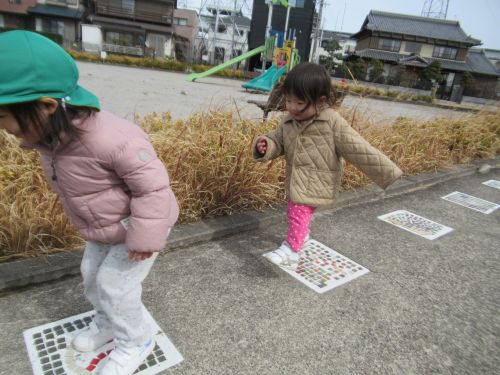 りす組のお友だちの姿を見てひよこ組のお友だちもまねしてブロックの上を歩いたり、ジャンプして後についていったり楽しく身体を動かして遊べました![]()