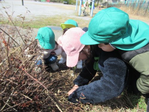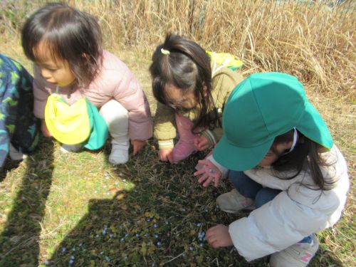 ひとりのお友だちが先生こっち着てお花お花🎵と教えに来てくれたのがきっかけに足元に小さな花がたくさん咲いているのを皆で触ったり取って集めたりしていましたよ![]()