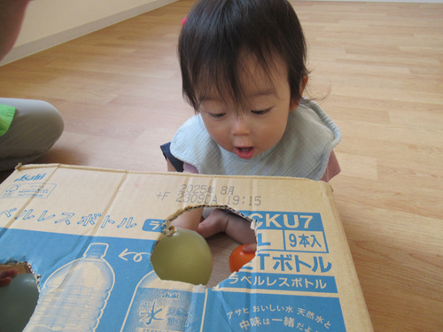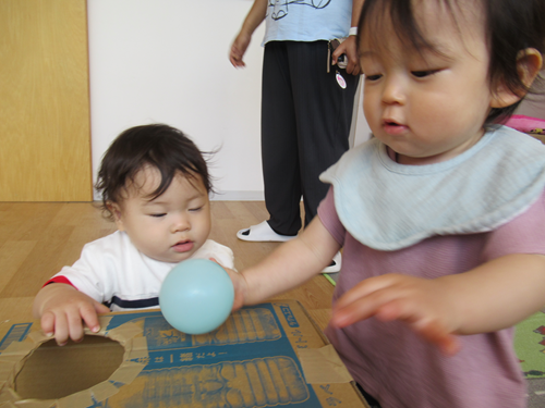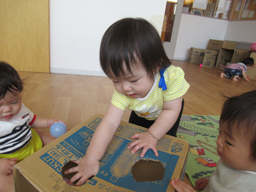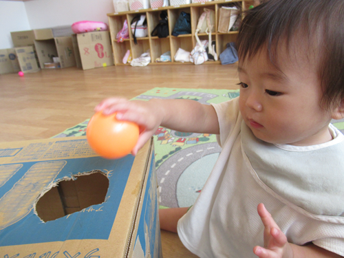 先ほど覗いていたお友だちもボールを手にして穴に入れています。