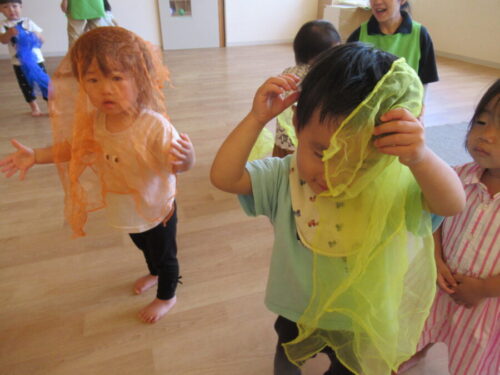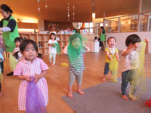 その他の子はお部屋で久しぶりにリトミックスカーフを出して遊びました![]()