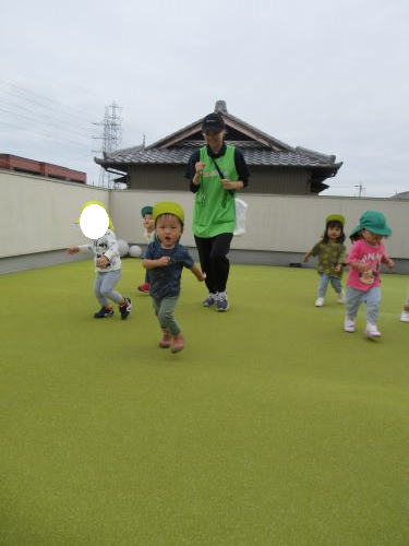 先生が言わなくとも子どもたちで並んでかけっこが始まっていたので、先生も交えて一緒によーいドン!とかけっこをして遊びました![]()