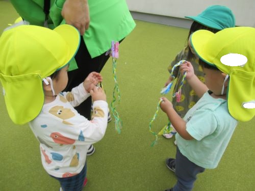 しっぽが取れるとイェーイと喜んで先生のエプロンにつけにきてくれる子もいたり、自分の服に付けてもらってキャーと逃げるのを楽しむ子もいましたよ![]()