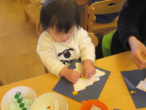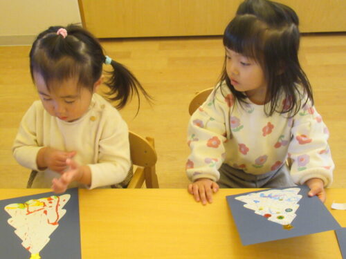 シール貼りをしてクリスマスツリーに飾りつけをしていきましたよ💗