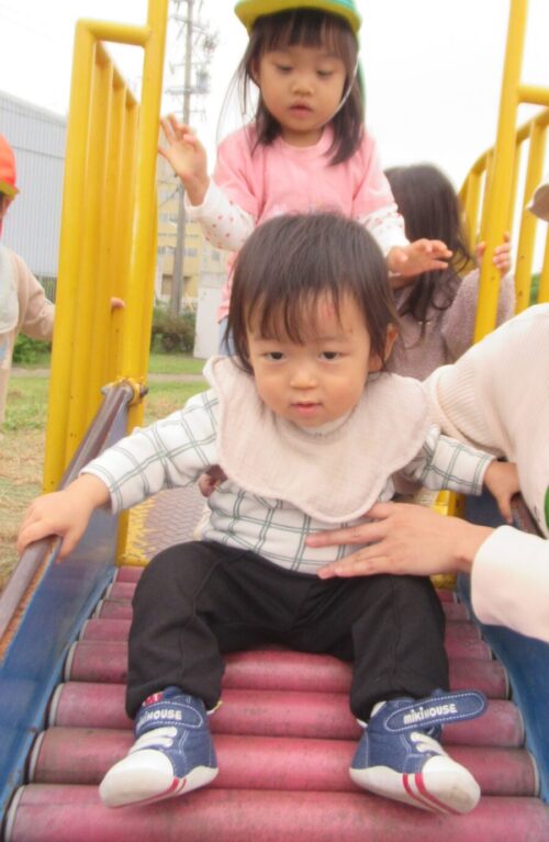 ひよこぐみさんも自分でお山を登って、興味を持って滑っている様子がありお姉さんと一緒に繰り返してすべり台を楽しんでいました!